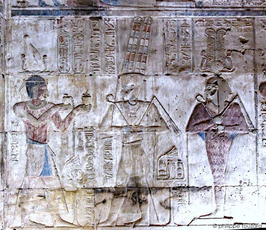 Le roi Ptolémée Évergète II  fumigène de l'encens et verse une libation pour