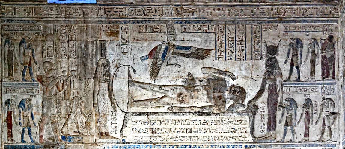 Allongé sur un lit en forme de lion Osiris repose ithyphalliqueue. Il est représenté comme un jeune homme et veillé à droite par Isis,la grande, mère du dieu, œil de Rê, maîtresse du ciel,et à gauche, par Nephtys, œil de Rê, maîtresse du ciel, souveraine de tous les dieux.. Osiris qui réside dans Thèbes est le seigneur d'Ipet-Ouret.