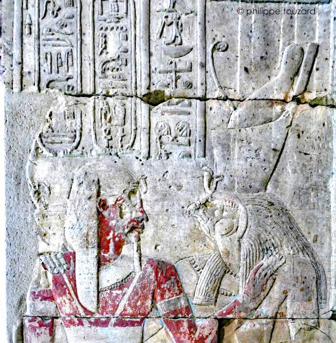 Le roi Ptolémée Évergète II  donne l'accolade à Haroèris, seigneur de Haute Égypte, grand de force. Le dieu lui donne toute l'Égypte. (Opet 132)