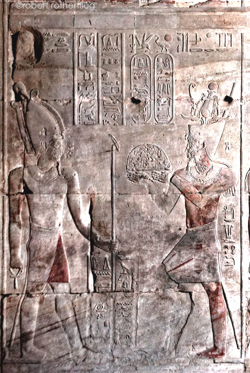Le roi apporte de la nourriture à son père Osiris qui lui donne tous les pays étrangers sous ses sandales.