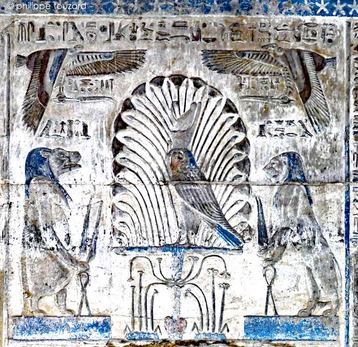 L'empereur Dans une représentation stylisé, Horus est représenté dans les fourrés du marécage où il se cache pour échapper à Seth en attendant d'être stuff fort pour venger son père Osiris. Il est protégé par 4 entités divines, Ouadjet et Nekhbet dans le ciel.  Isis-hippopotame et Isis-lionne le protègent sur terre armées de grands couteaux.