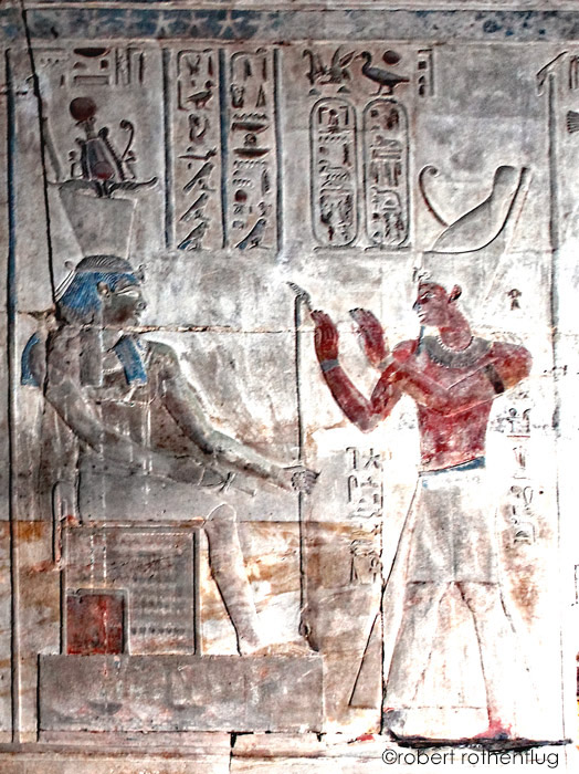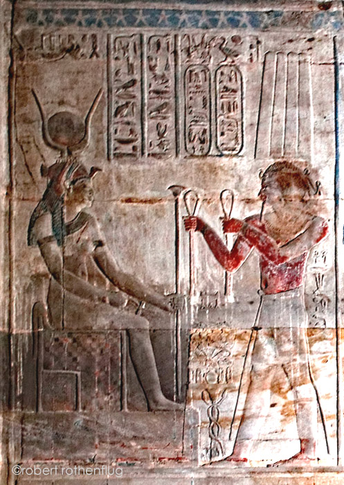 Le roi Ptolémée Évergète II offre des tissus à Isis la grande, mère du dieu, Œil de Rê, maîtresse du ciel souveraine de tous les dieux (épithètes habituelles). Isis lui augmente la crainte qu'il inspire.