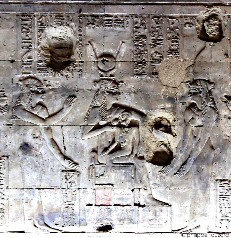 À gauche, Meskhenet-Neferet protège Horus. La déesse Meskhenet personnifie le siège d'accouchement : elle est souvent représentée dans les scènes de théogamie.