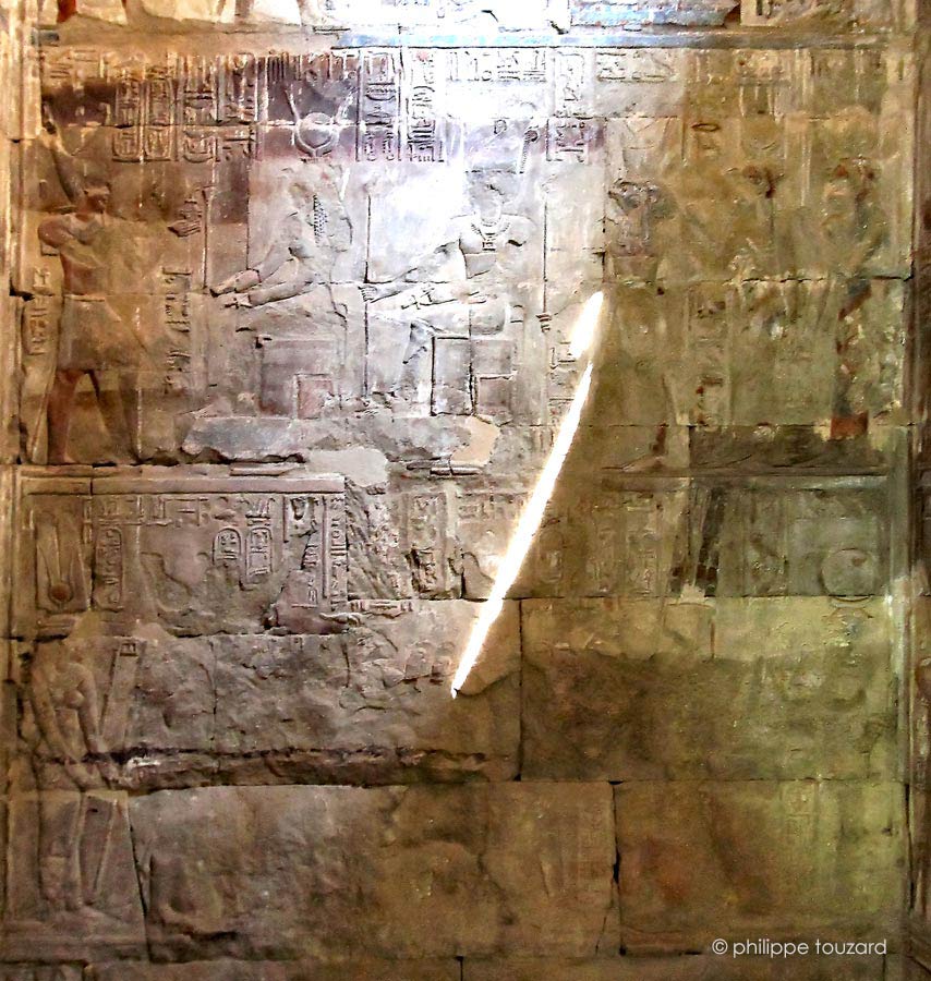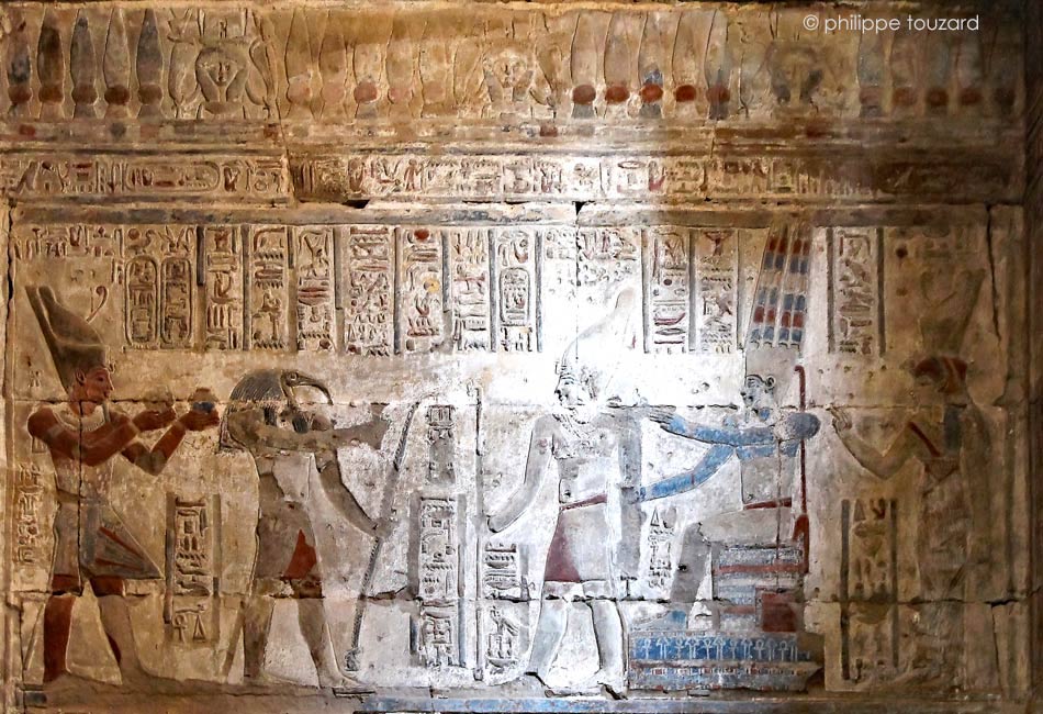 le roi Ptalémée Évergète II   fait l'offrande du lait à Ipet-Ouret et Osiris assis sur des trônes, suivis d'Haroéris, Isis et Nephtys.