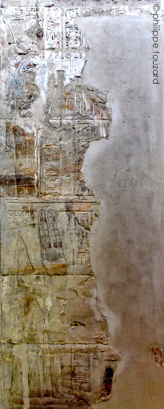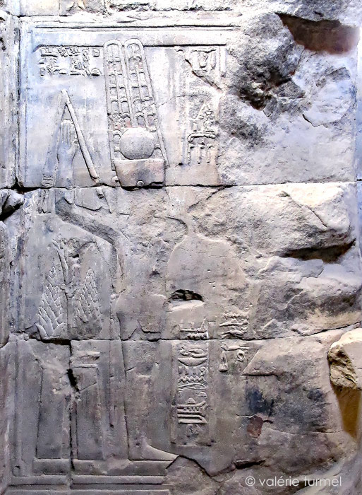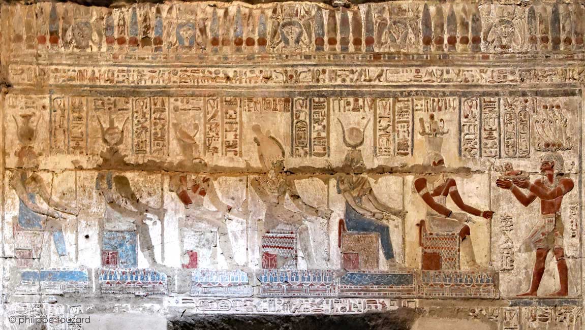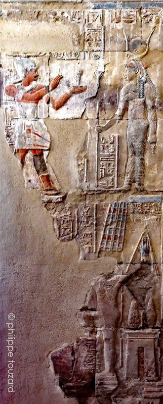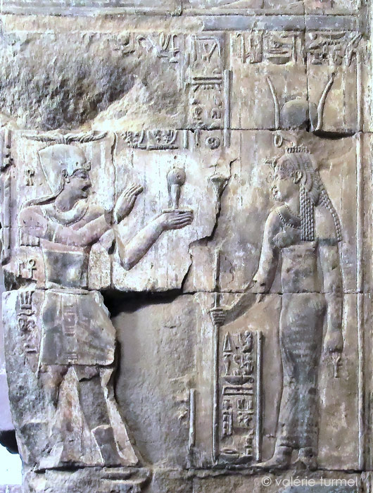 Le roi offre le collier menat à Râttaouy, qui réside dans Médamoud, Sechat, Séfékhet-Âboy, œil de Rê. La déesse donne au roi tout ce qui existe sur terre.,