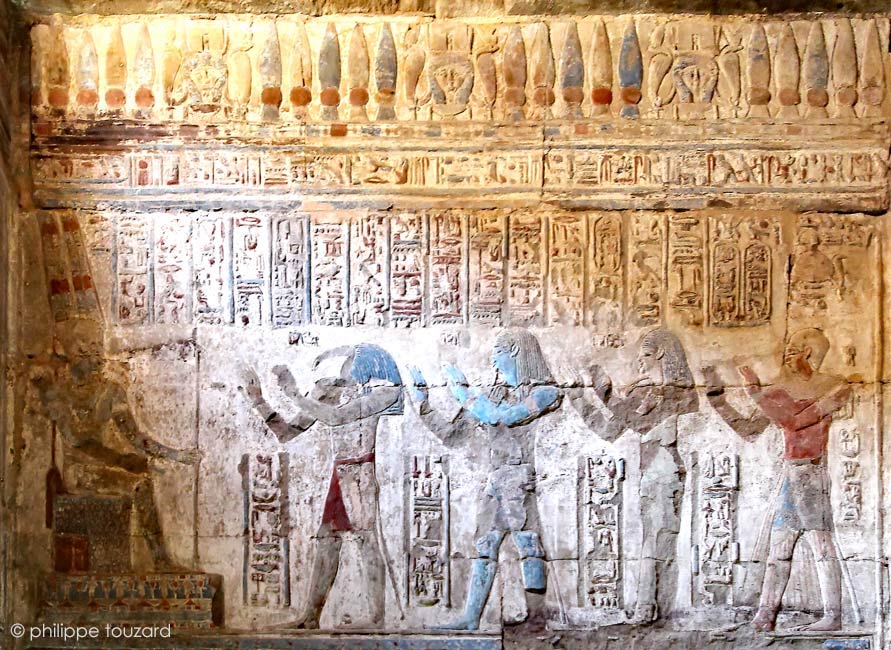le roi Ptalémée Évergète II   présente  une offrande  (indéterminée) à une assemblée de divinités. : Hathor, maîtresse de Iounet (Dendera); Hathor, maîtresse de Thèbes ; Hathor, Neb-Hetep , toutes les trois œil de Rê, maîtresse du ciel, et Mout,la grande, maîtresse d'Ichérou, suivie de Khonsou, roi de Basse Égypte, enfant premier d'Amon.
