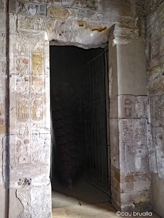 Sur les montants, sont écrits le nom de roi de Haute et Basse Égypte suivi du nom de Ptan  à l'Ouest et d'Amon-Rê à l'Est.
