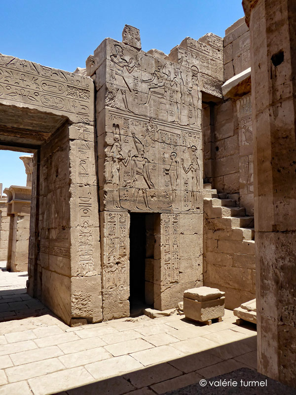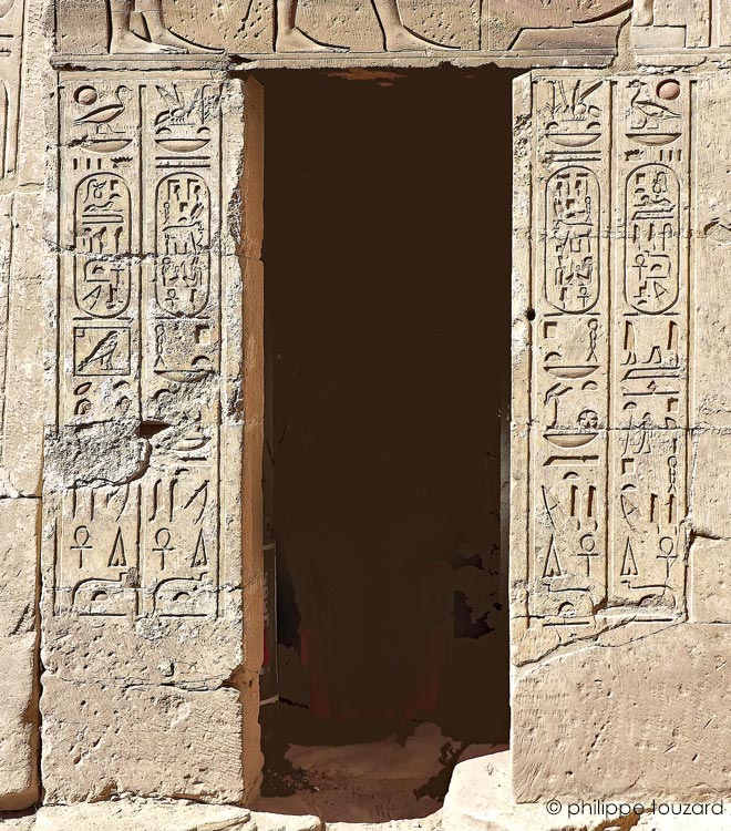 La porte en dessous est datée de Ptolémée Philopator Sur chaque montant, sont inscrits les noms de roi de Haute et Basse Égypte, ainsi que le nom de fils de Rê.