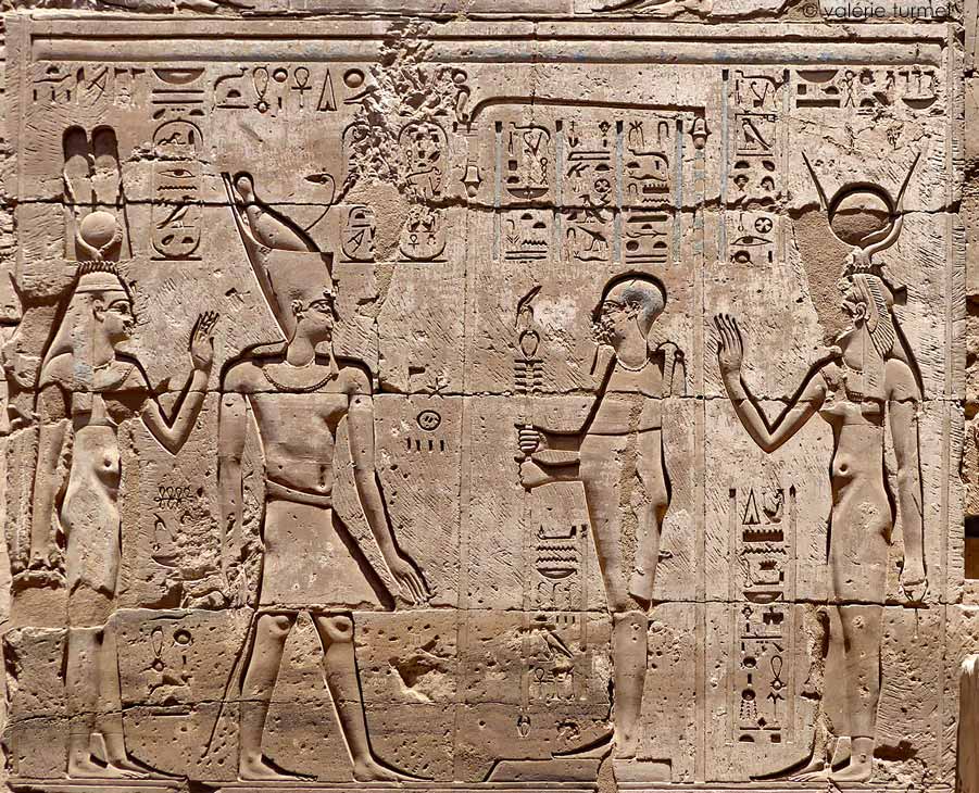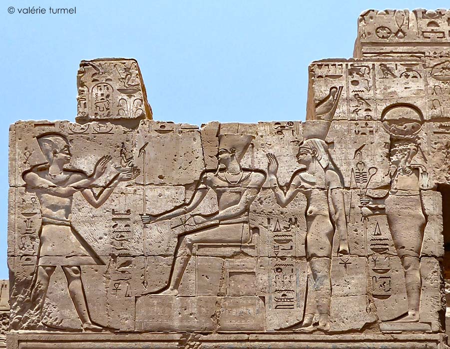 Ptolémée Philopator offre la Maât à son père Amon accompagné de Mout et Khonsou, formant ainsi la Trilogie Thébaine. Les inscriptions sont lacunaires. Mout est dite la maîtresse du ciel. Khonsou, le faucon maître de la joie donne au roi toute vie, toute autorité et toute santé. (Cfeetk, Ptah 118)