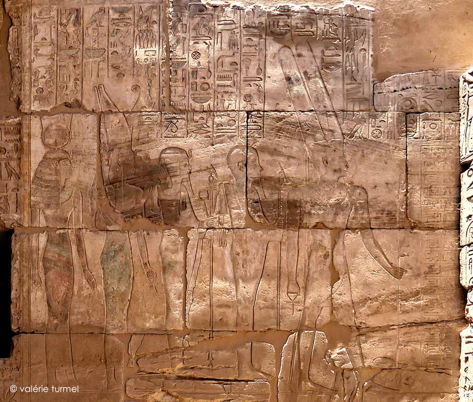 Les divinités sont conduites par Amon, le seigneur des trônes des Deux-Terres. qui est à la tête d'Ipet-Sout (le temple de Karnak). Derrière Amon, vient Ptah, le maître de la vérité, qui réside dans Thèbes Puis suit Khonsou dans Thèbe. Ensuite la déesse Mout, qui est prééminente dans le  temple de Ptah et Hathor de Thèbes, la maîtresse du ciel, épouse de dieux, fille de Rê.