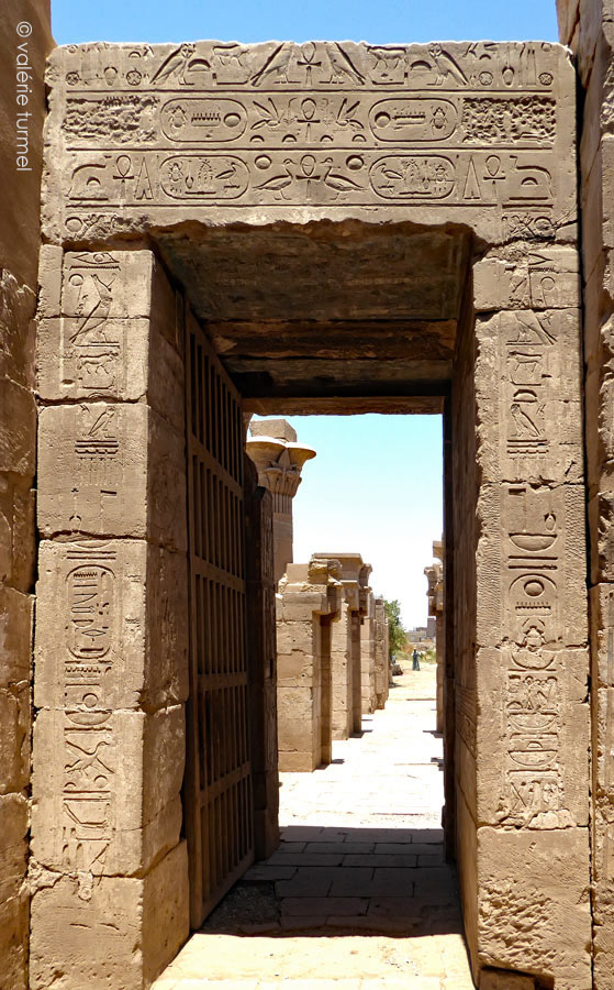 Les inscriptions y sont symétriques par rapport au signe Ankh. La première ligne donne le nom d'Horus, la deuxième celui des roi de Haute et Basse Égypte (des parties du texte sont martelées) et la troisième le nom de fils de Rê. Le texte est légérement différent de celui du linteau de l'entrée.
