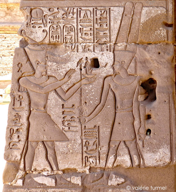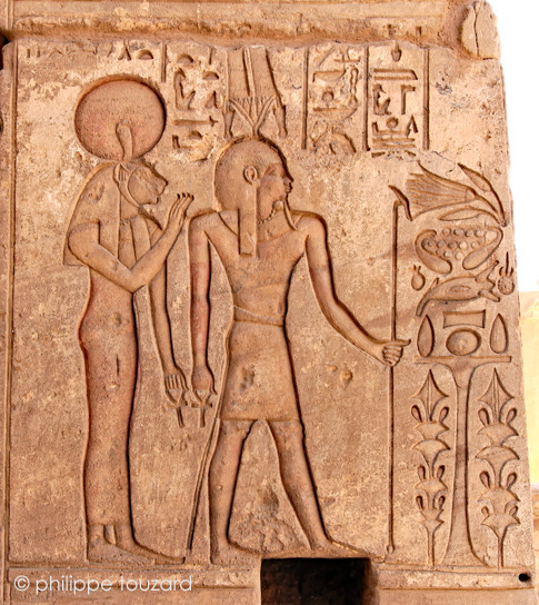 Ptolémée Évergète 1erjoue du sistre et offre la menat à Somtous l'enfant et Hathor maîtresse de  Thèbes.Somtous est debout sur un pavois avec un signe sema-taouy en dessous, associé à son nom.(Cfeetk, Ptah 104)