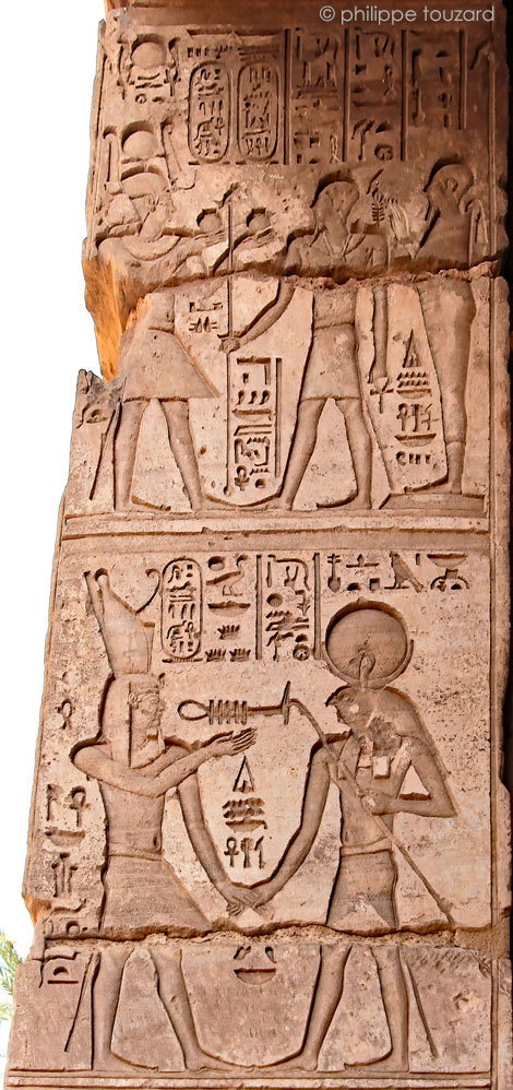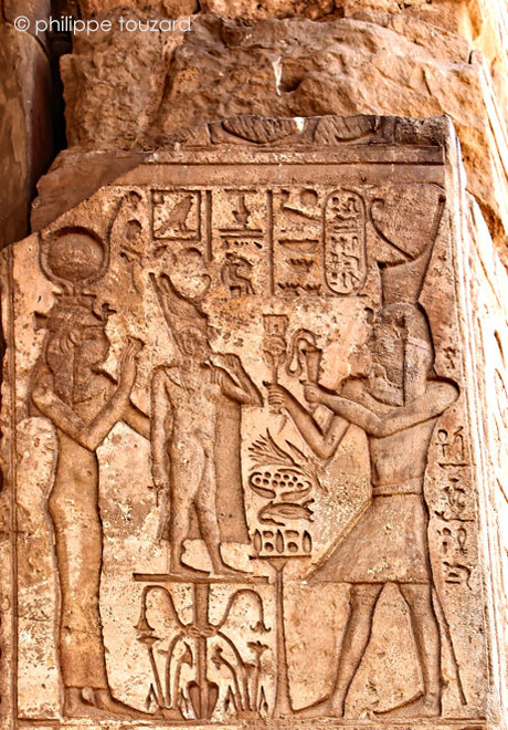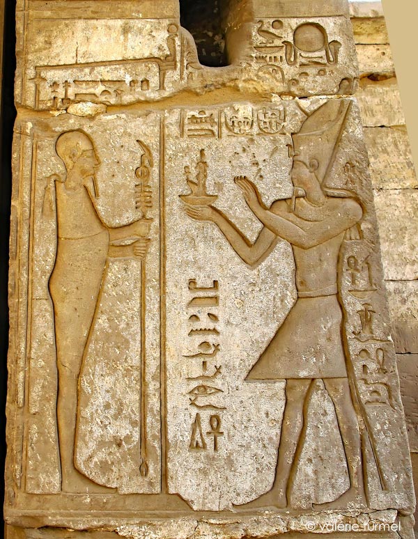Le roi offre la Maât à Ptah seigneur de Thèbes, le maître de la vérité. Behdety vole au dessus de la scène.