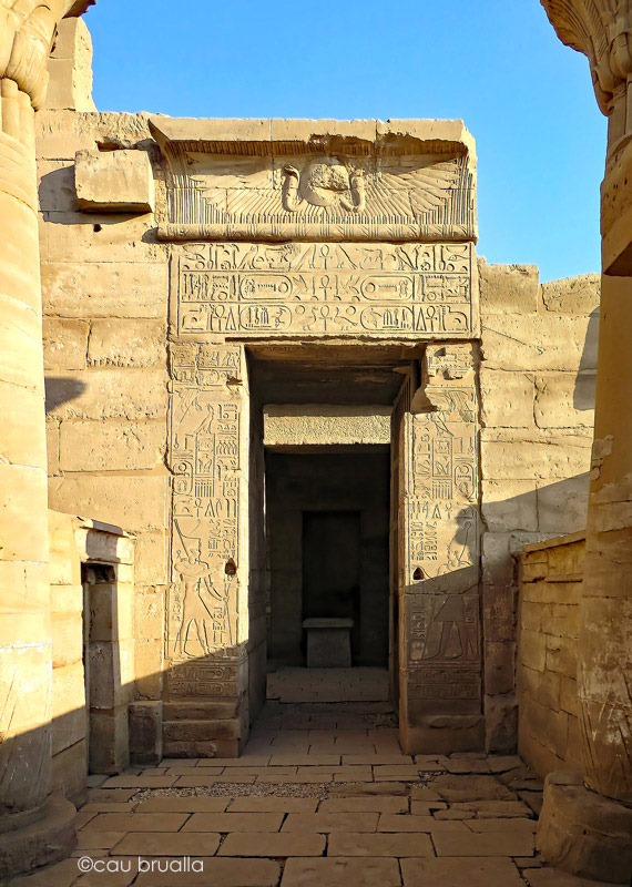 La porte d'Évergéte conduit à la porte d'entrée du temple qui porte la titulature de Thoutmosis III. Comme avec un vrai pylône, le passage vers la cour est décoré de petits tableaux et de grandes scènes.