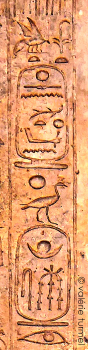 Sur la colonne de droite sont inscrits les 3 noms du roi Sénakht-en-Rê Ahmès : le nom d'Horus, le nom de roi de haute et Basse Égypte et le nom de fils de Rê.