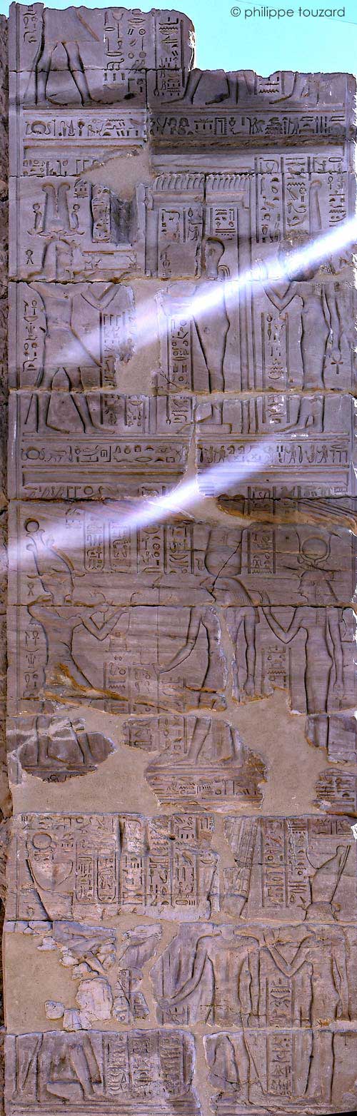 Ptolémée Philométor fait l'offrande de la campagne à Amon-Rê, le maître du trône du Double-Pays, à l'avant de Karnak, accompagné de Khonsou qui réside dans Thèbes, le seigneur de la justice. Béhédet   protège la scène.
