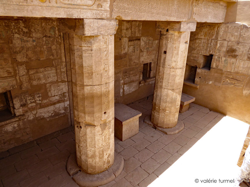 La partie Est de la cour se trouve sous un portique soutenu par deux colonnes à 16 pans Les 4 grandes scènes en bas-relief mettent en jeu Thoutmosis III. Six niches sont creusées dans les murs et contenaient des statues royales. Au milieu de la paroi Est, une porte décorée donne accès aux trois salles formant le sanctuaire.
