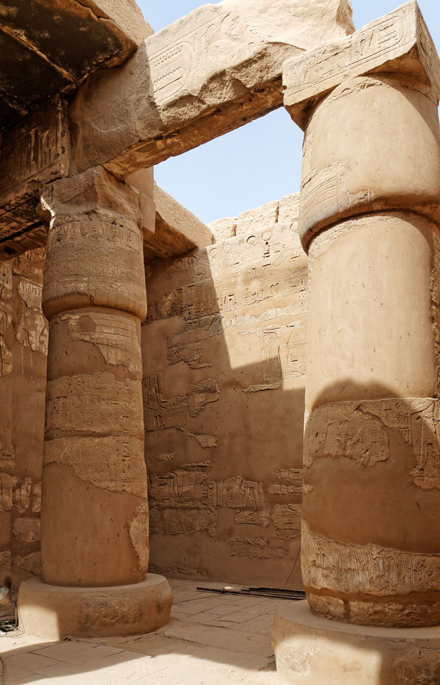 Cette vue permet de voir les 2 colonnes de ce côté et une partie de la paroi Ouest. Les scènes sur les colonnes et sur la paroi sont relativement endommagées.