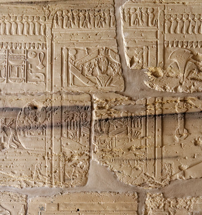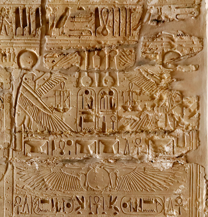 En bas, Horus est posé sur un piédestal sur lequel se lit 'Aimé d'Amon'. Horus est sans doute une représentation du roi. De chaque côté de cette scène du bas, un oeil oudjat, et les fleurs du Sud et du Nord.