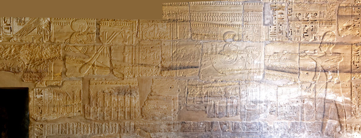 Le côtéCes pavois ou enseignes divines sont tenues par alternativement des signes ankh, djed et ouas. Des personnages 'le roi sans doute) se tiennent sur des plateformes à l'avant. Les figures représentent 2 fois le Bélier d'amon, 2 fois Horus, Oupouaout, le roi, ??, Hathor, un signe Ouas (signe séthien?), encore le roi. Ensuite des instruments de la royauté et un sistre.