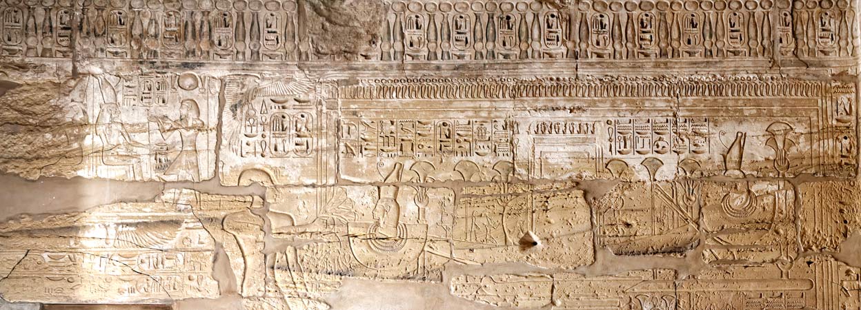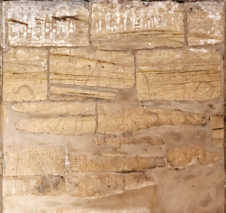 Le roi est devant la barque de Mout qui est posée sur un socle dans une chapelle. Une frise avec les noms du roi court au dessus de la scène.