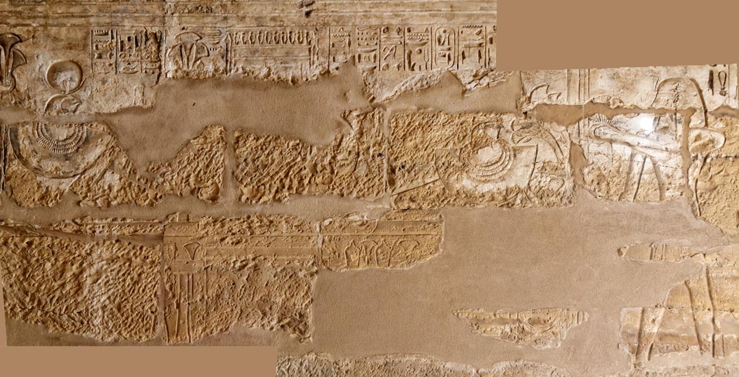 Le roi présente des fleurs à la barque de Khonsou posée sur un socle dans la chapelle. La scène est également assez endommagée: les détails de la barque sont perdus. Derrière le roi, 2 scènes avec Khonsou que vous pouvez voir ci-dessous.