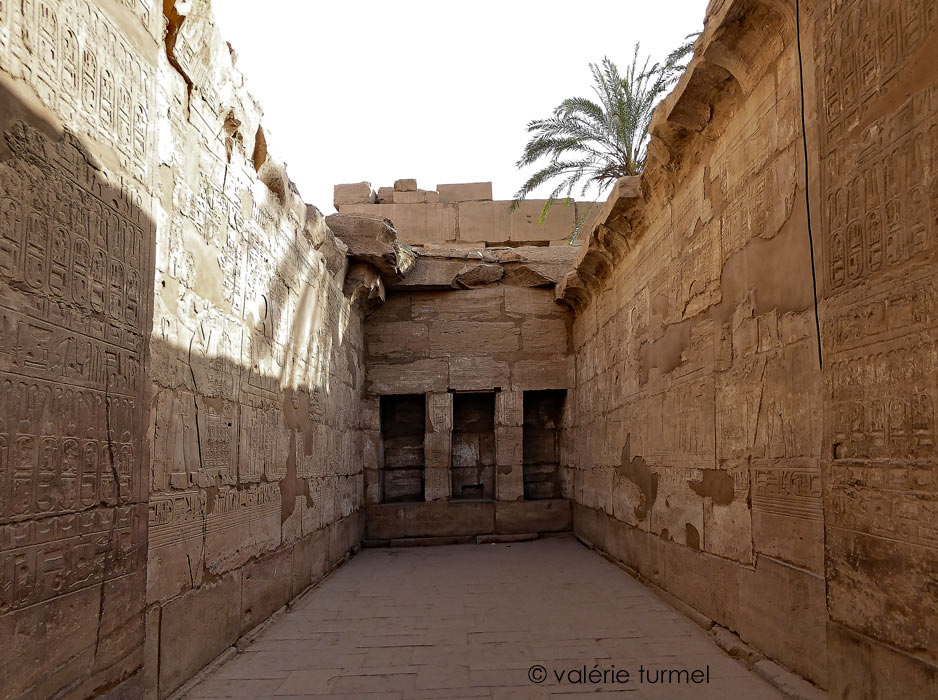 À l'avant-plan, les embrasures des portes sont couvertes d'inscriptions..Les deux paeois latérales montrent la Barque d'Amon devant le roi et la Triasde tghébaine dans une scène complémentaire. Le fond de la chapelle comporte 3 niches décorées.