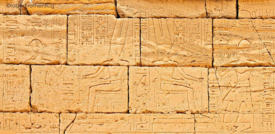 Les scènes de cette paroi sont divisées en 2 parties, comme on peut le voir ci-dessus avec 2 scènes identiques, à gauche du côté est, à droite du côté ouest. Le mur a été consolidé à une époque inconnue, les scènes à l'extreme ouest sont donc manquantes.