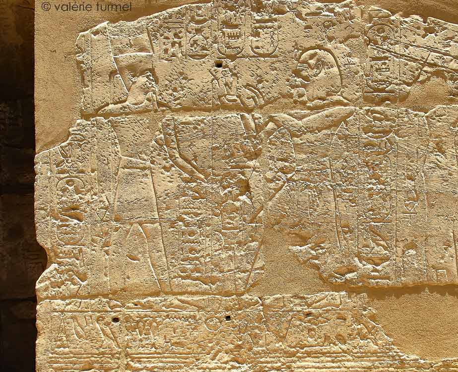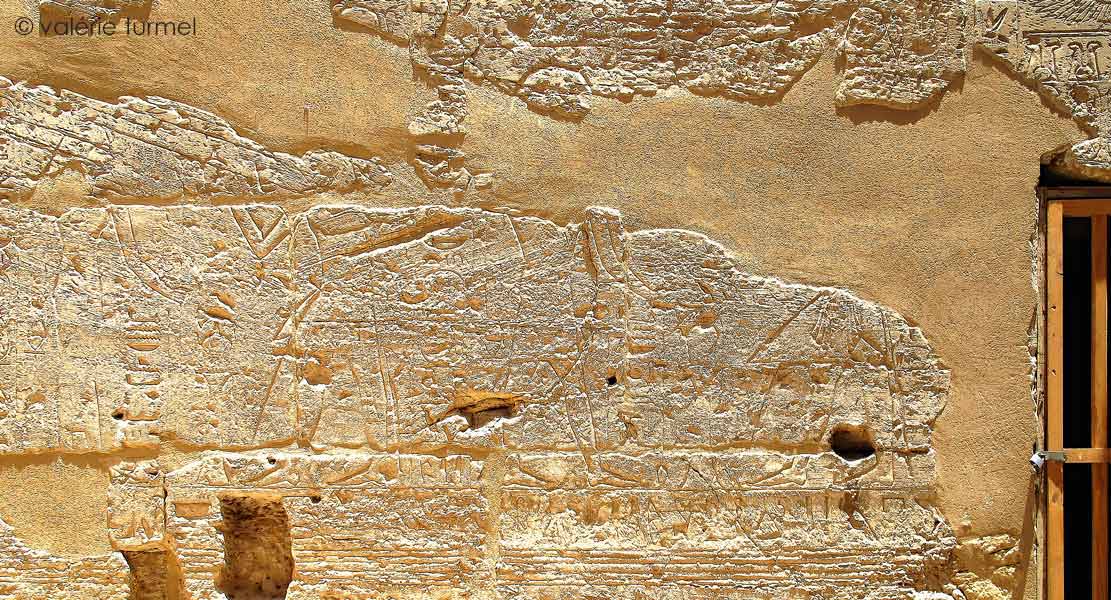 Cette paroi comporte trois grandes niches et deux registres de scènes d'offrandes du roi à différentes divinités.
