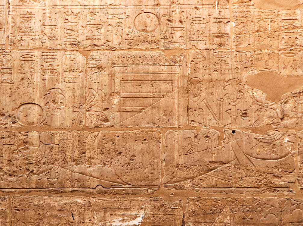 La triade thébaine : le roi Sethy II présente la Maât à la Triade Thébaine, Amon, Mout et Khondou.. Les dieux tiennent des signes ankh et des sceptres, assis sur des trônes dans une chapelle. Des fleurs sont posées dans la chapelle. Le roi reçoit d'eux toute vie, stabilité, pouvoir, toute santé, les années d'Atoum ainsi que l'éternité et la bravoure,