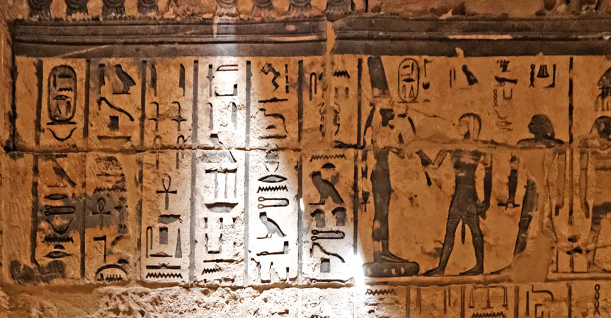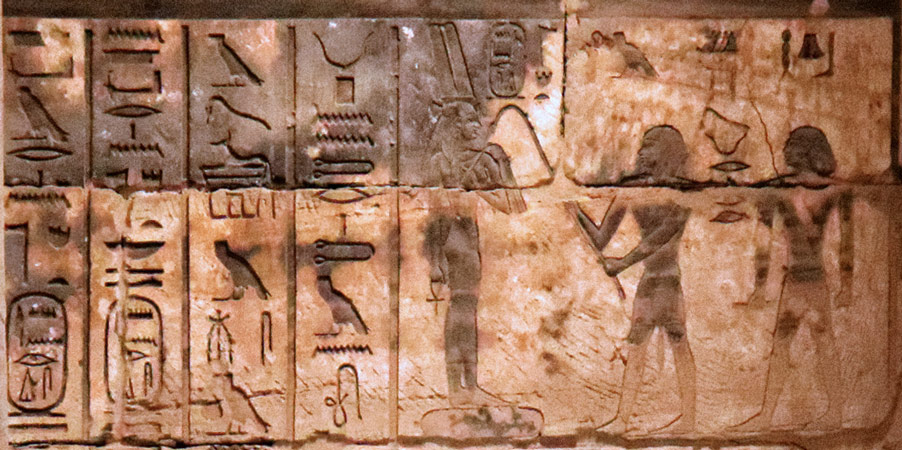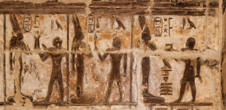 Rituel d'ouverture de la bouche avec une herminette terminée par une tête tenue par le prêtre Sem.