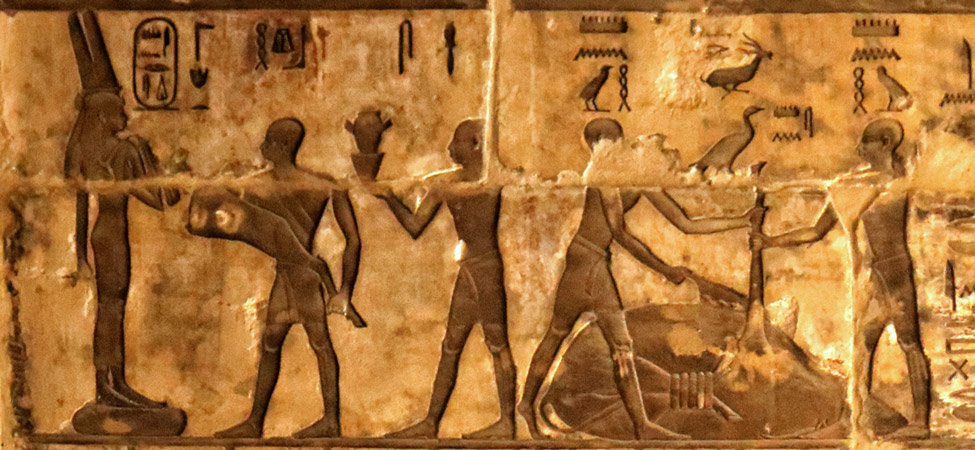 A gauche, dans une autre scène, le prêtre-lecteur présente la cuisse, morceau de choix à la momie.