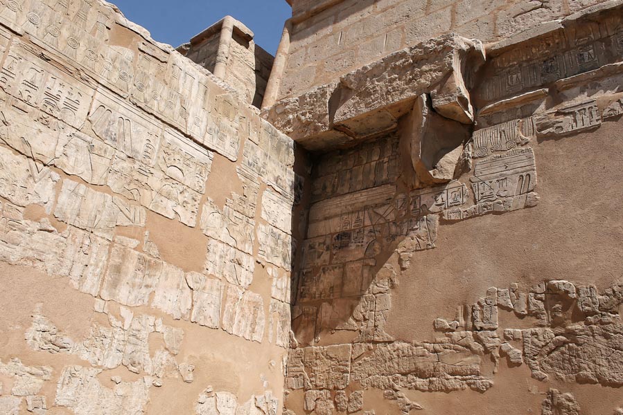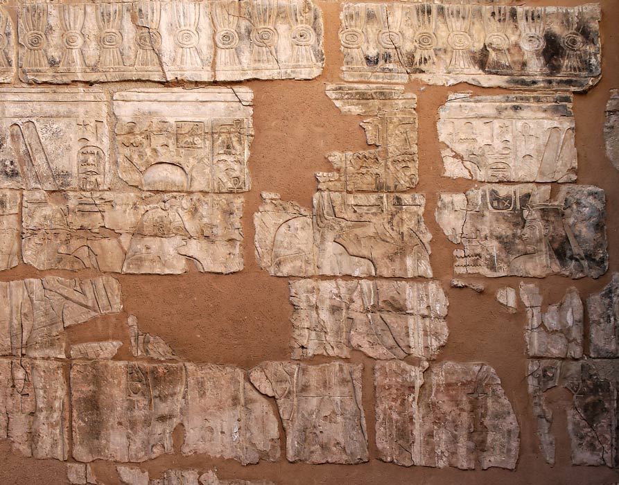Cette vue montre le coin Nord-Ouest. Sur le côté Nord, à droite, une scène très dégradée représente Shepenoupet II devant Osiris, Horus et Amenirdis décédée (détail en cliquant ici). Le côté Ouest à gauche est détaillé ci-dessous