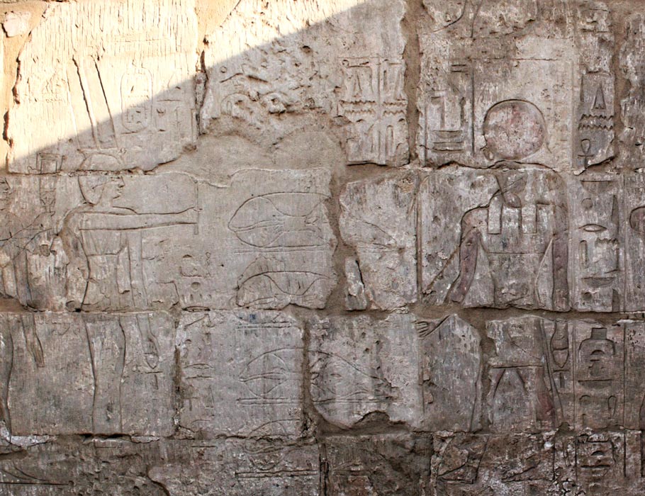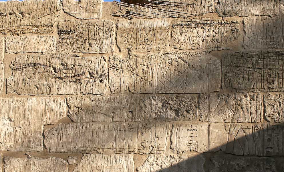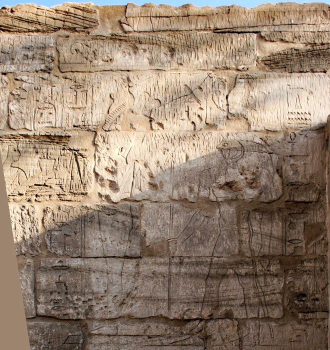 Scènes du registre supérieur : on distingue 2 scènes fortement détériorées par une série de stries.