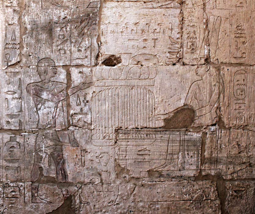 Nitocris et la princesse Mehrytenousekhet présente des quartiers de viandes comme offrandes à Rê-Horakhty.