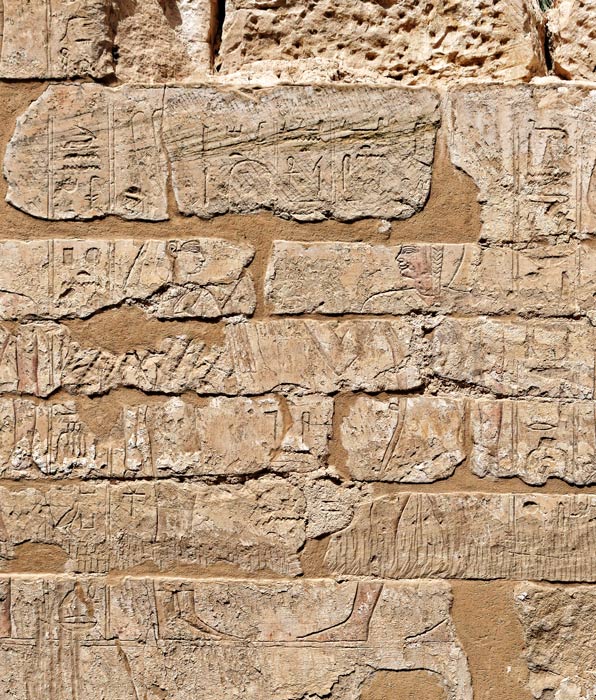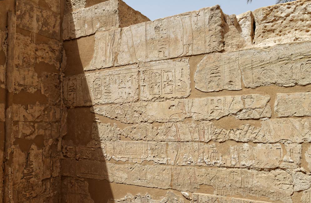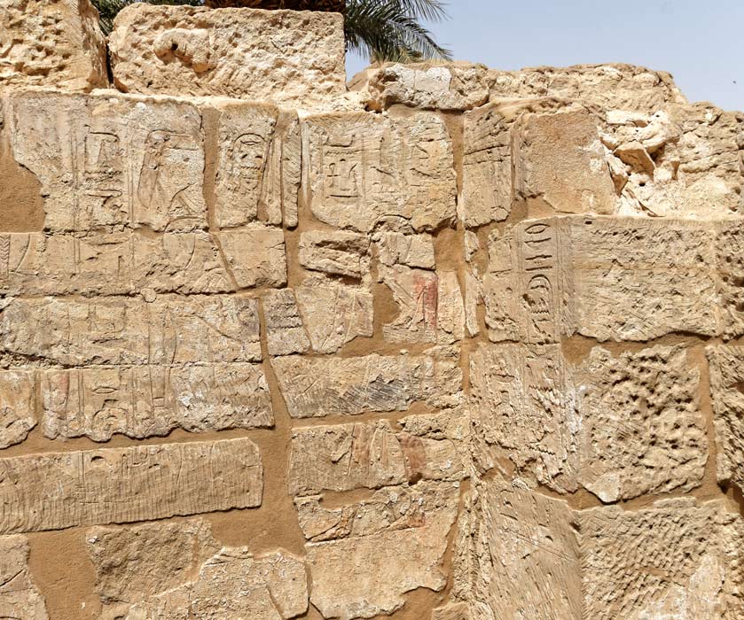Sur cette image, on distingue 4 scènes. A gauche, à côté de la fausse porte, la princesse saïte est en adoration. Au milieu, deux registres : en haut, un reste de scène où la princesse sse tient devant Osiris et un autre dieu. En bas, le prêtre Iounmoutef présente des offrandes à la princesse. A droite, le début d'une scène complète ci-dessous.