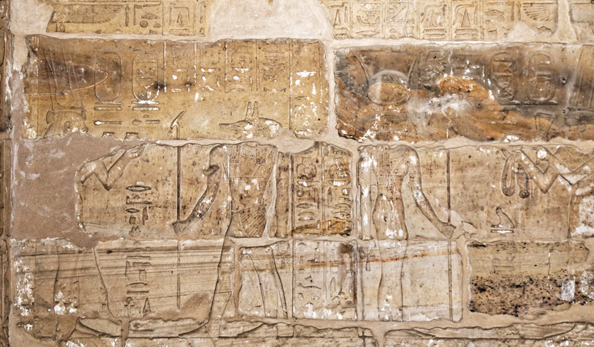 A gauche : en haut, Shepenoupet II consacre des victuailles à Anubis. En dessous, elle fait des offrandes à Hathor.