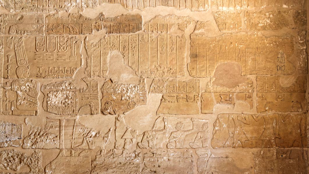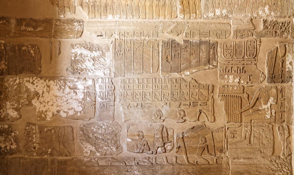 Scène de gauche en entrant : Shepenoupet II est assise devant une table d'offrandes dont la liste est détaillée au milieu de la scène. Chaque colonne de la liste se termine apr un personnge présentant une offrande. Devant Shepenoupet, une suite de personnages.