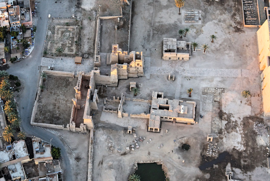 Cette vue prise de ballon permet de situer les tombes des Adoratrices en haut sur l'image, à droite du migdol, dans la cour entre l'entrée du grand temple et le temple lui-même. ,