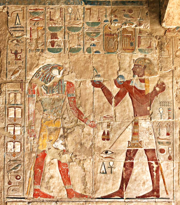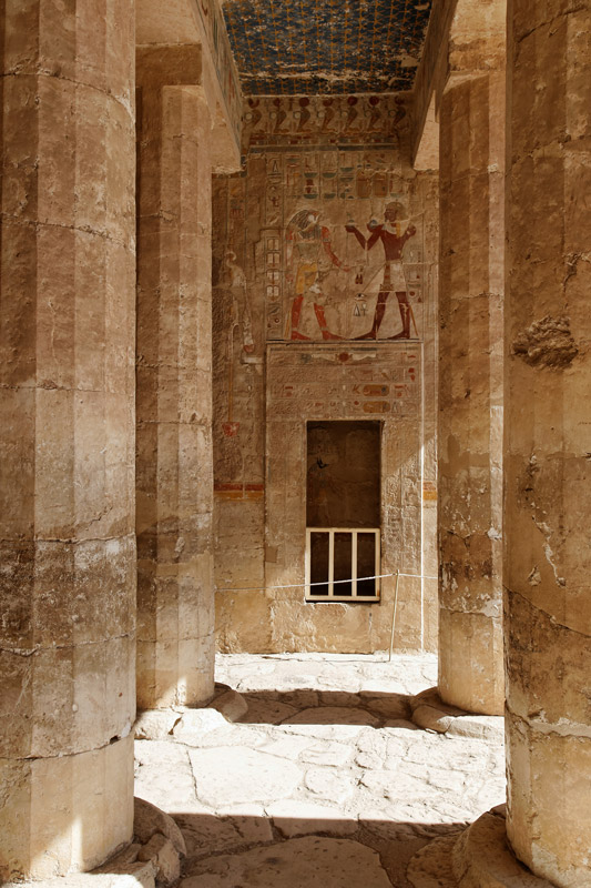 Au dessus de l'encadrement de la niche, Thoutmosis II offre du vin au dieu Sokar, autre dieu lié au royaume des morts. Hatchepsout tenait à ce que le roi en titre soit également représenté dans cette chapelle.