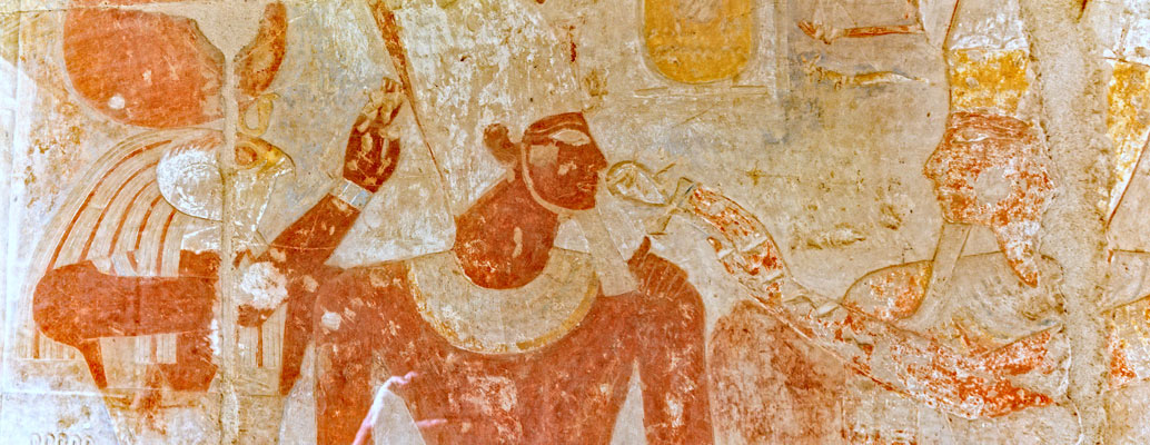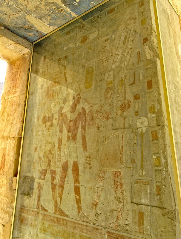 Dans le passage qui méne au vestibule précédant la chapelle solaire proprement dite, a été placée cette scène. Thoutmosis II, reçoit la vie du dieu Amon. Le roi, mari d'Hatchepsout est dans les bras de Rê-Horakhty. Il se dirige vers l'intérieur des salles solaires.