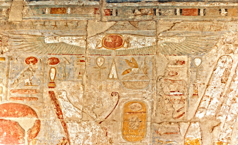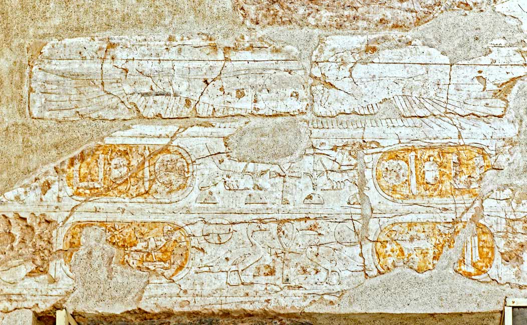 En haut, le disque solaire ailé avec les noms des dieux et le cartouche de Thout mosis II.