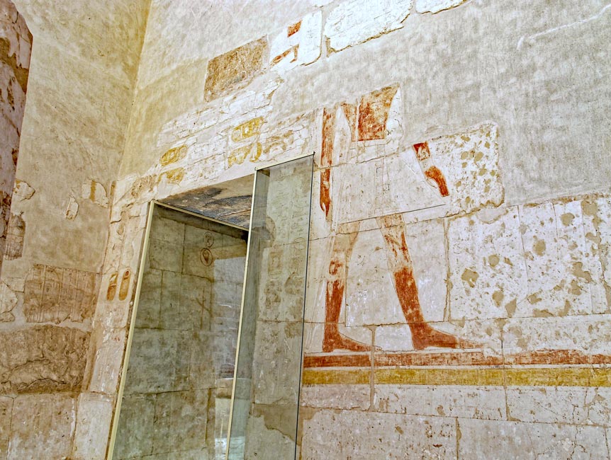 A gauche les cartouches de Thoutmosis II et à droite, ceux de Thoutmosis III qui remplace ceux d'Hatchepsout.Sur