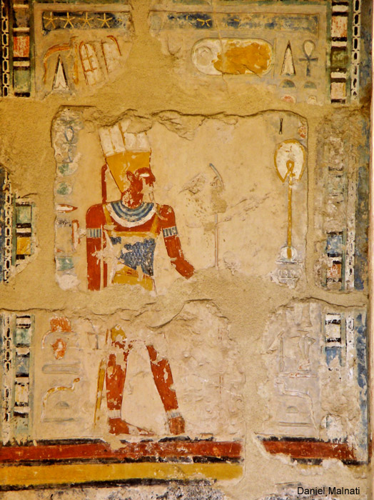 Au fond; la statue de la reine : Hatchepsout porte le pschent. Derrière la statue, les restes d'une scène où Thoutmosis II est embrassé par Amon.