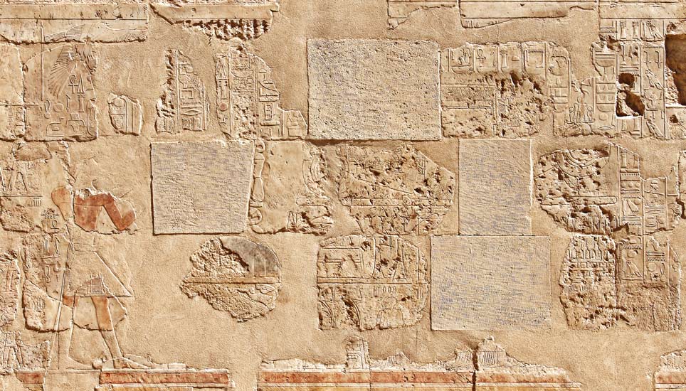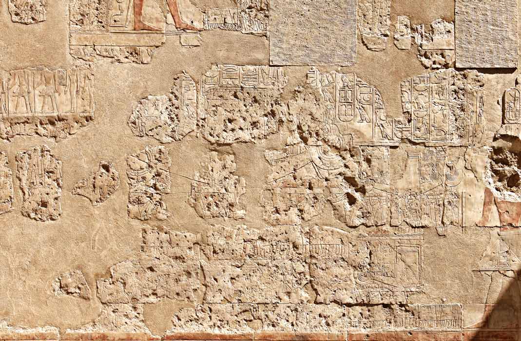 Scène la plus à droite du mur nord : les 3 barques sont transportées par des prêtres : la plus grande pour Amon et les 2 autres plus petites pour Mout et Khonsou derrière. La reine (son cartouche a été remplacé par celui de Thoutmosis) suit le cortege. Les barques sont précédées par des dieux et des déesses. En agrandissant, on peut reconnaître le cartouche de la reine Ahmès en haut à gauche. Au-dessus de cette scène, une autre scène du même genre, mais avec Thoutmosis, dernière scène du retour des barques.