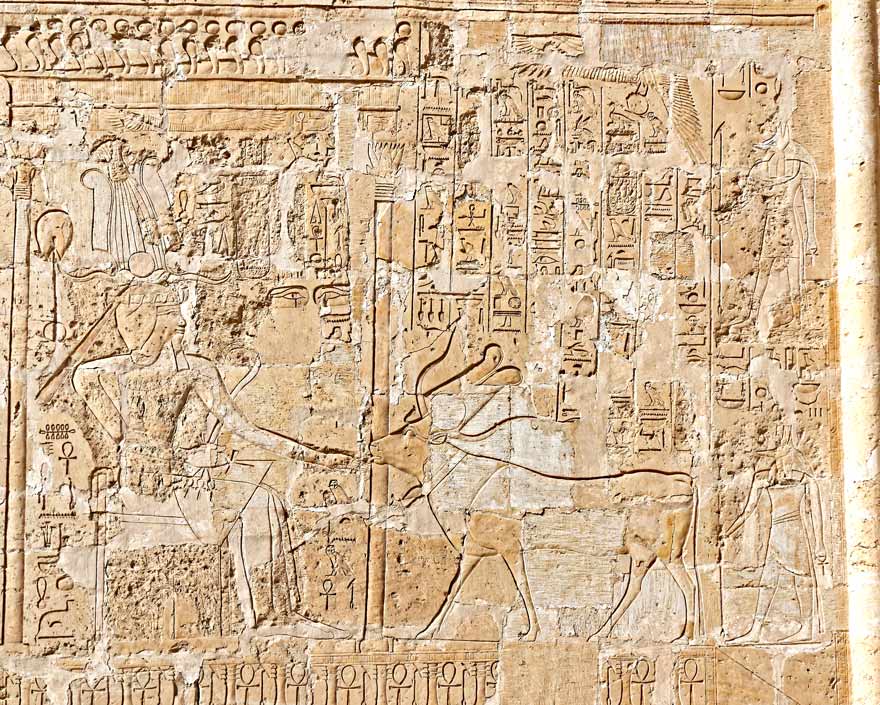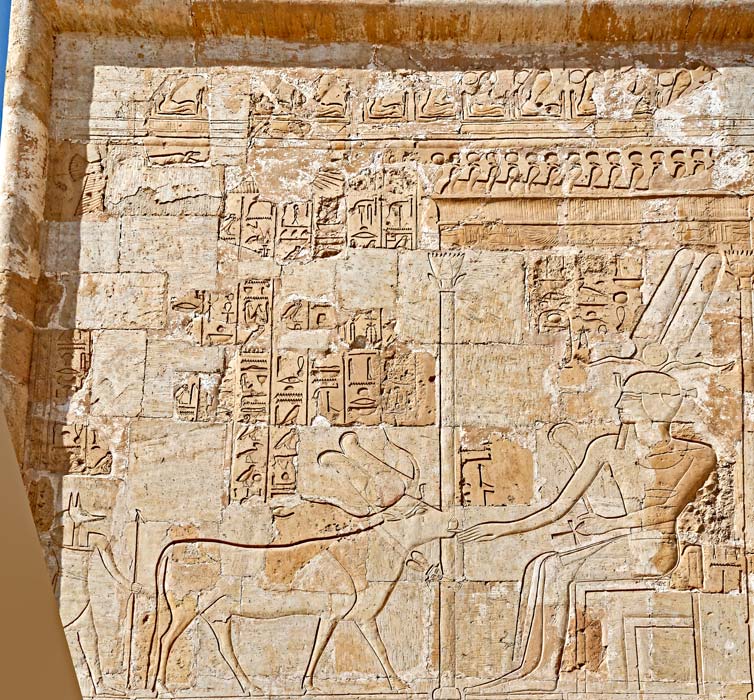Les deux scènes de la façade sont symétriques et représentent toutes deux Hathor venant lécher la main du souverain, ici la reine. Hathor est représentée en vache, comme d'ailleurs sur presque tous les murs de la chapelle. Elle porte une coiffure ressemblant à celle d'Isis, et l'uraeus. Elle est suivie de deux divinités anthropomorphes avec des têtes de canidés, appelées Anubis par Porter et Moss. C'est une image forte liant Hathor
