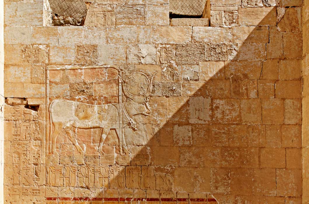 Hathor sort d'un naos. Elle porte le disque solaire et autour du cou, un sistre 'hathorique' avec une tête d'elle-même.