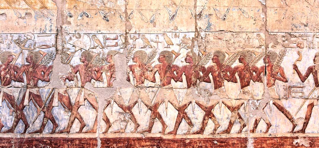 Un soldat tient en laisse des félins. Derrière lui, des Lybiens dansent, un baton de jet à la main.. Les autres Lybiens battent la cadence avec leurs batons de jet.