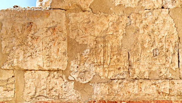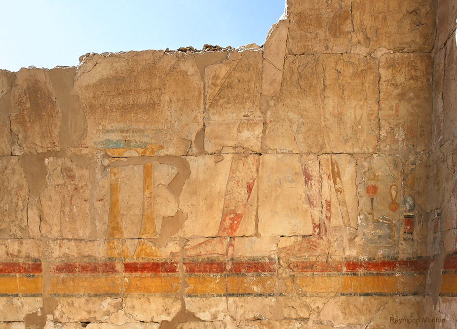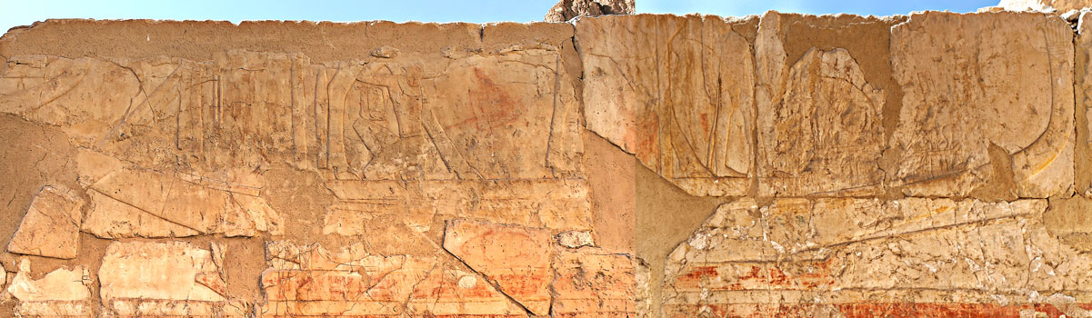 Les personnages sont sur une barque tirée par les prêtres représentés sur la vue de dessus. Le dernier à gauche bénit la barque. En haut, à gauche de la vue de dessus, le cartouche de Thoutmosis 1er qui est sans doute le personnage devant la barque. Derrière le roi, son père, la reine(?) téte la vache Hathor. La déesse Hathor est dans un naos et il ne reste que ses pattes. A l'avant de la barque, un cobra et Horus annoncent la venue royale. La scène de la reine en train de téter est représentée 3 fois dans la chapelle, une fois à l'intérieur du sanctuaire (planche 105 de Naville) et 2 fois sur ce mur sud. Cette scène a été reconstituée avec 3 photos.