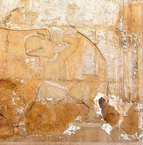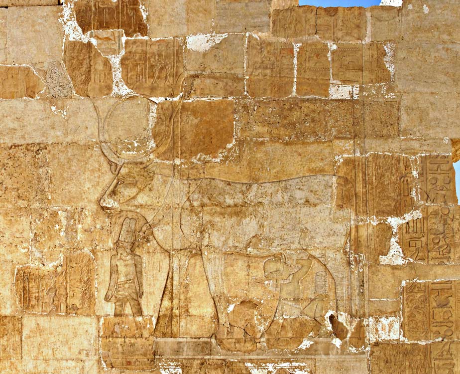 Hathor est représentée dans son naos. Devant elle, Thoutmosis II et dessous elle, la reine Hatchepsout se nourrit de son lait. Avec le fluide sacrée, la reine acquiert une nature divine. Il lui assure également la renaissance dans la vie éternelle.